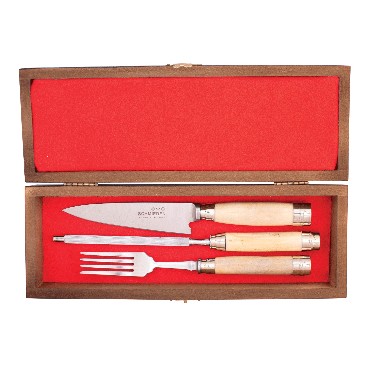 Juego Para Asado CuchilloTenedor y Chaira Acero Inox Schmieden 5 Encabados En Hueso y Alpaca Con Caja Fina